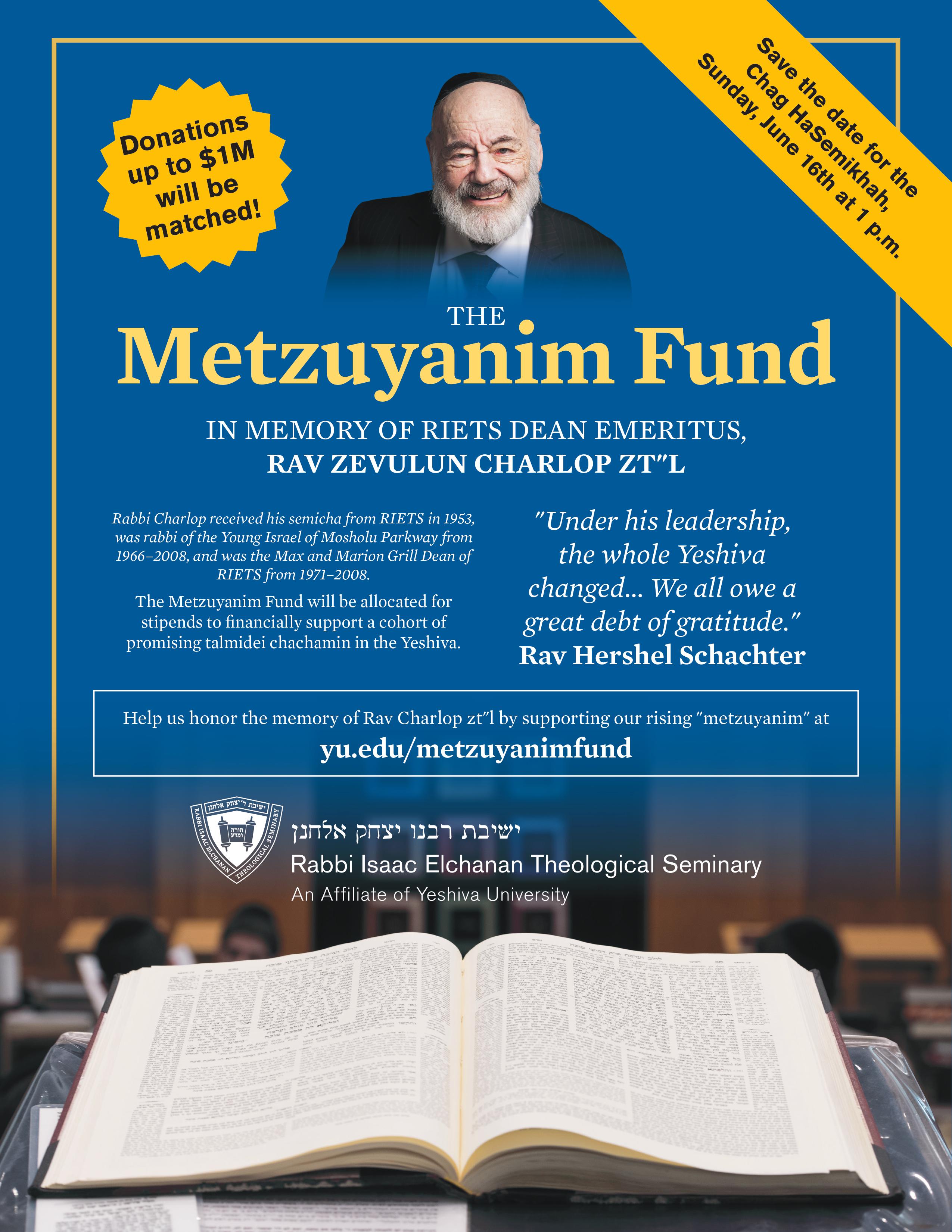 Our Dean Emeritus, Rabbi Zevulun Charlop Zt"l, was a pillar of the RIETS community for decades and aided countless talmidim (or, as he would say, "metzuyanim") on their path to becoming rabbanim. As we prepare to celebrate the Chag HaSemikhah, we are privileged to establish the Metzuyanim Fund in his memory to financially support a yearly cohort of promising talmidei chachamim learning in our kollel. Thanks to a generous donor, contributions will be matched up to $1 million! Please consider supporting our rising metzuyanim in order to continue the tradition of excellence and success in learning that Rabbi Charlop embodied. Donations can be made at https://es.udk4m.shop/MetzuyanimFund