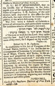 Perhaps the most telling item about the Jewish situation in America during this time period is a legal notice in The National Advocate, a New York City newspaper, on March 25, 1824. In what may well be the first time Hebrew typeface appears in an American newspaper.